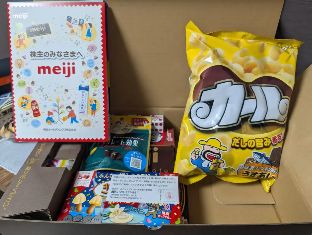 さて、では早速届いた優待品を見ていこうと思います。自社グループ製品(主にお菓子)の詰め合わせになります。私は権利確定日現在で明治株を200株保有していたので、今回の優待は200株以上でもらえる2500円相当の詰め合わせになります。明治の株主優待は、100株以上、200株以上、1000株以上と保有株数に応じて3種類の自社詰め合わせ製品がもらえます。同等品を福祉団体等へ寄贈することもできます。