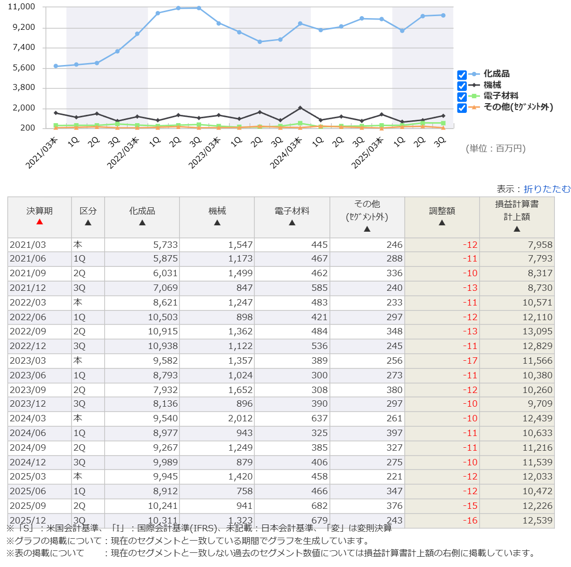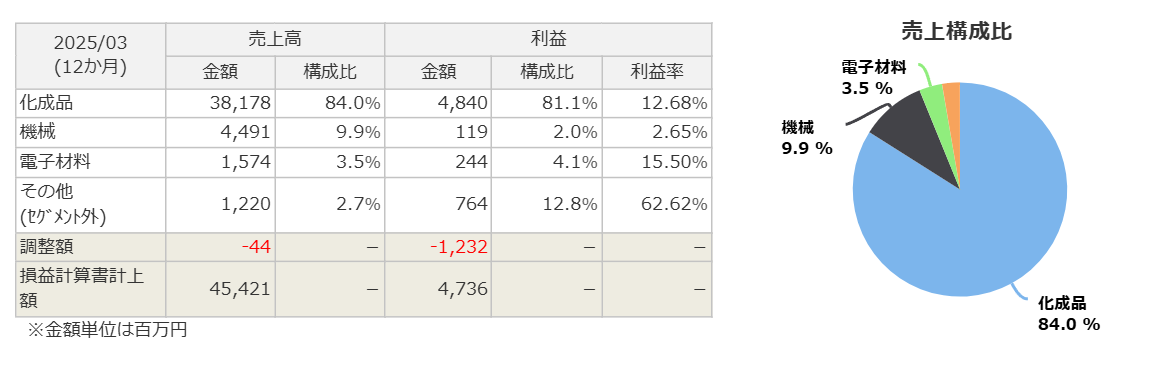 化成品の利益率を超えて電子材料の利益率が15.5%と高く、ここが次の成長ドライバーとして期待できそうです。