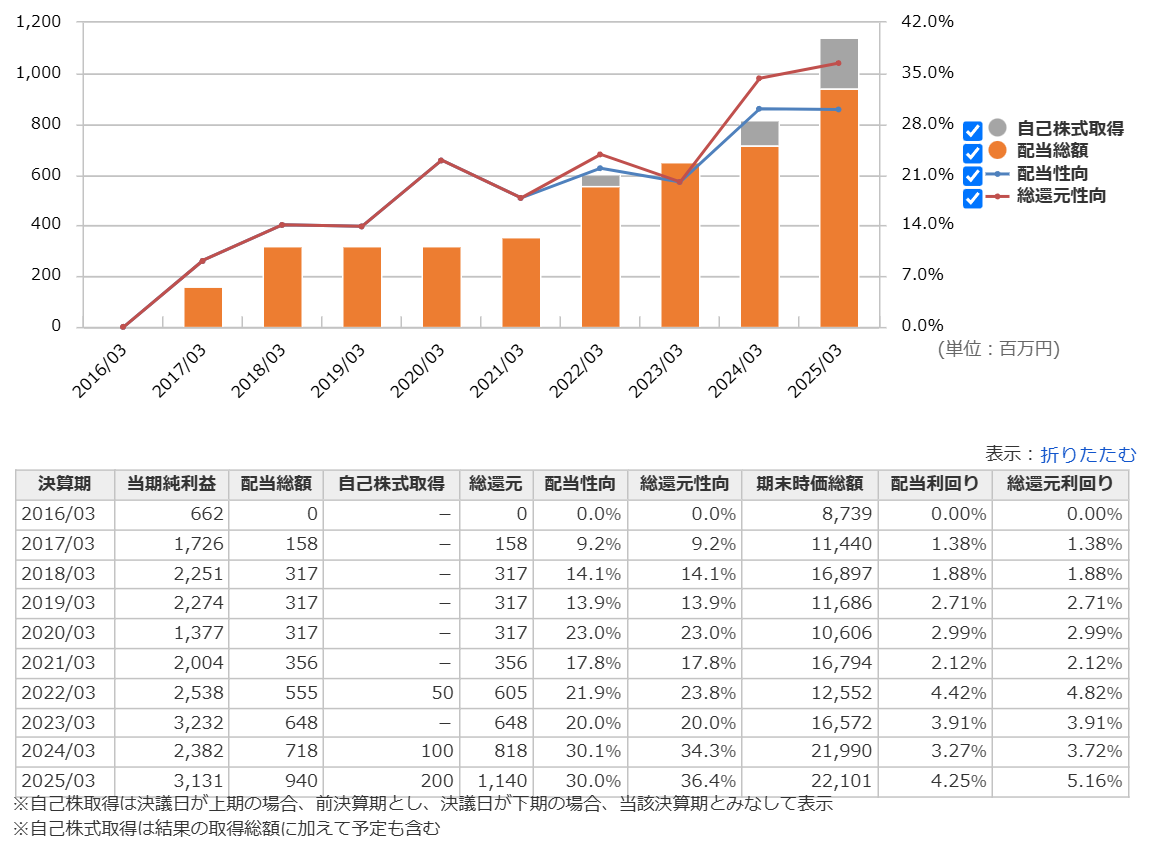 | 決算期 | 年間配当金 | 配当性向 | 総還元利回り | 備考 |