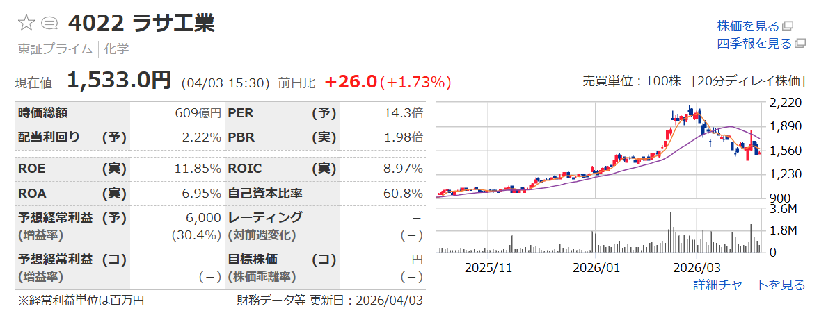 ラサ工業についてマネックス証券の銘柄スカウターを使って調べてみました。