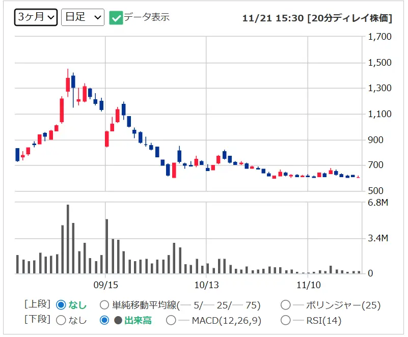 1450円の高値から900円台に下落したときに入りました。たしか決算後に期待外れで暴落したときにチャンスかなと思って入ったように思います。