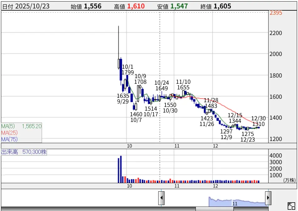 先月年初来安値の1275円まで下落して初日の最高値のおよそ半分まで下落しています。公募価格組は損をしていないものの、初日に買った人は全員損しているような状態です。