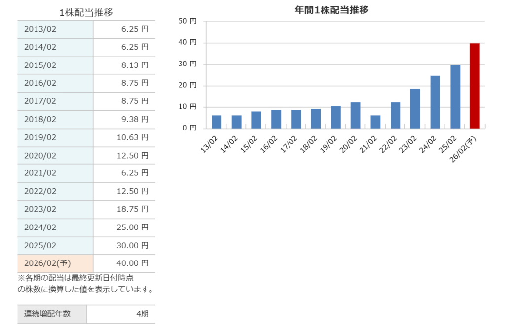 配当に関しては、2021年に減配をしておりますが、それ以降はずっと増配傾向にあります。業績成長も続いているので今後も年間1株配当については上昇するようにも思います。
